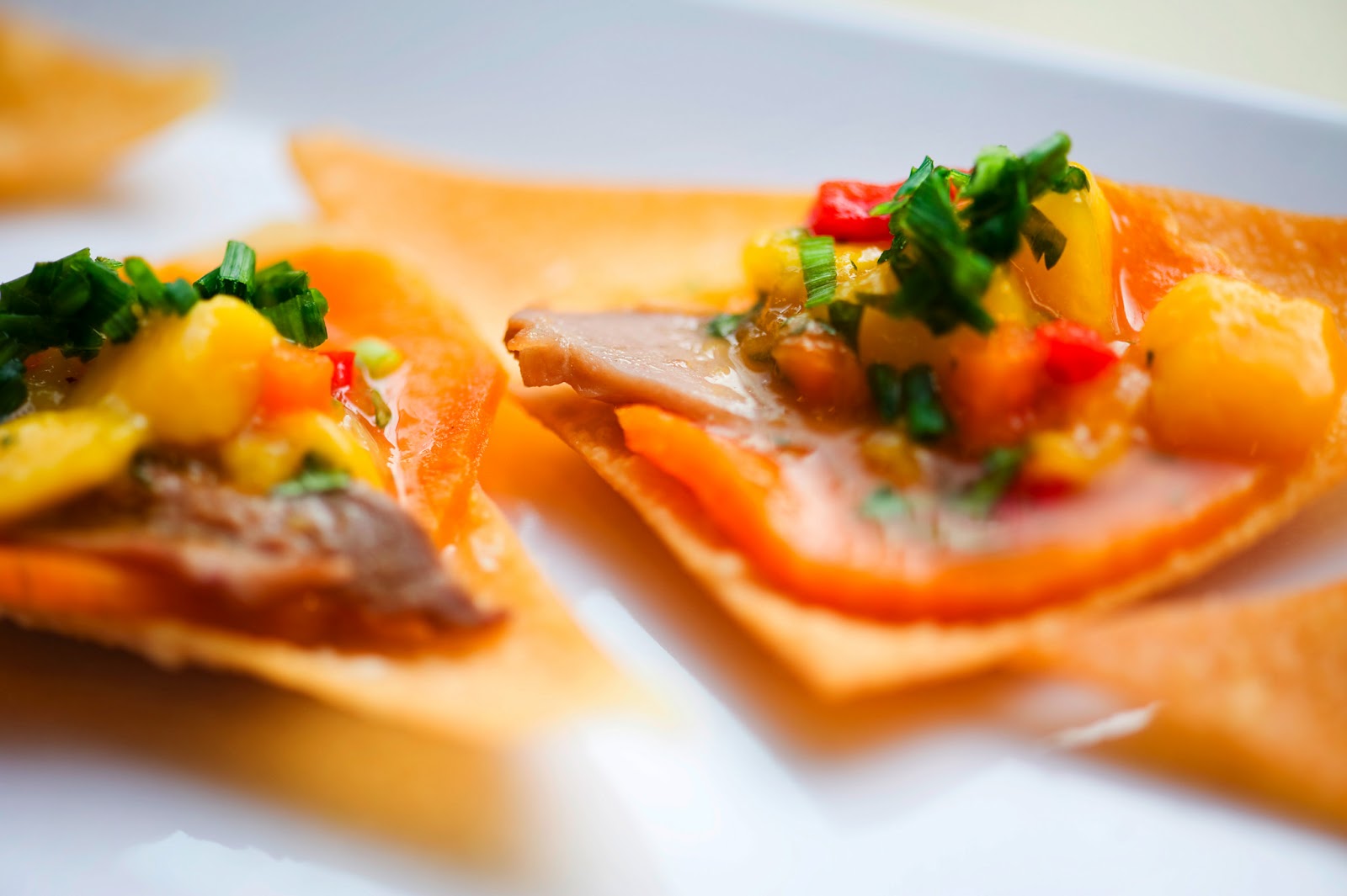This crispy wonton triangle is topped with a duck medallion, a sweet potato slice, and our signature tropical mango salsa. The sweet mango pairs nicely with the duck meat and the chip makes it easy to eat!